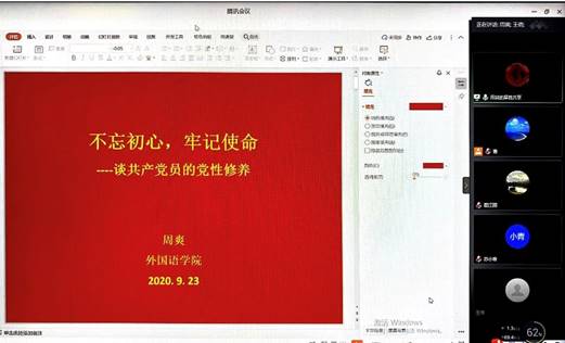 番号 副院长周爽为大学英语教学部党支部讲授党课 9月23日晚上,番号 副院长周爽在线上为大学英语教学部党支部讲授题为《“不忘初心、牢记使命”——谈共产党员的党性修养》的党课。