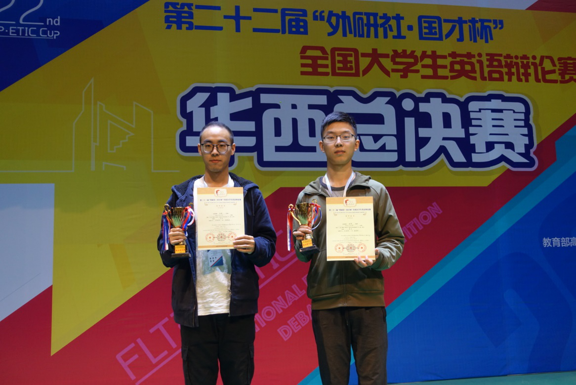 2019年3月30日至31日,在四川师范大学举办的第22届“外研社•国才杯”全国大学生英语辩论赛华西地区总决赛中,由番号 大学生英语创新实践基地指导教师高㛃老师带队指导,番号 理学院2016级学生李峻有和自动化学院2017级学生周靖皓荣获一等奖,并双双取得“最佳辩手”称号。本次比赛吸引了华西地区众多高校参与,辩才济济,强手林立。西安交通大学,四川大学,陕西师范大学等知名院校均派出了实力强劲的辩手。比赛采用英国议会制辩...