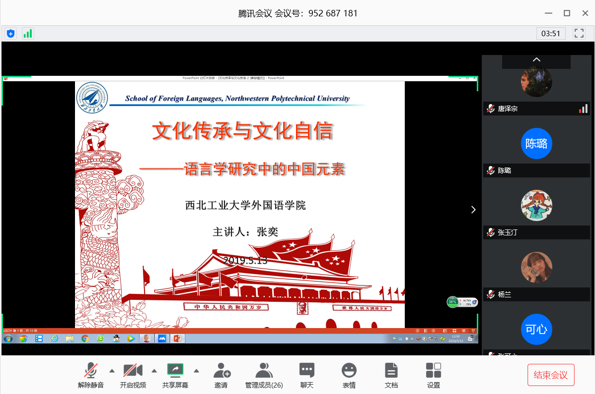 5月13日中午,番号 第十三期发展对象培训班第一次党课进行“云”开讲。副院长张奕为本、硕25名发展对象进行主题为“文化传承与文化自信——语言学研究中的中国元素”的讲座。为了让各位发展对象更好地将理论知识与学术实践相结合,张奕将《中国共产党章程》的理论知识与语言学研究现结合,与在线的同学分享自己对语言学研究中关于文化自信与文化传承的理解。她分别从背景介绍、中国语言学研究回顾、语言研究的中国化、文化...
