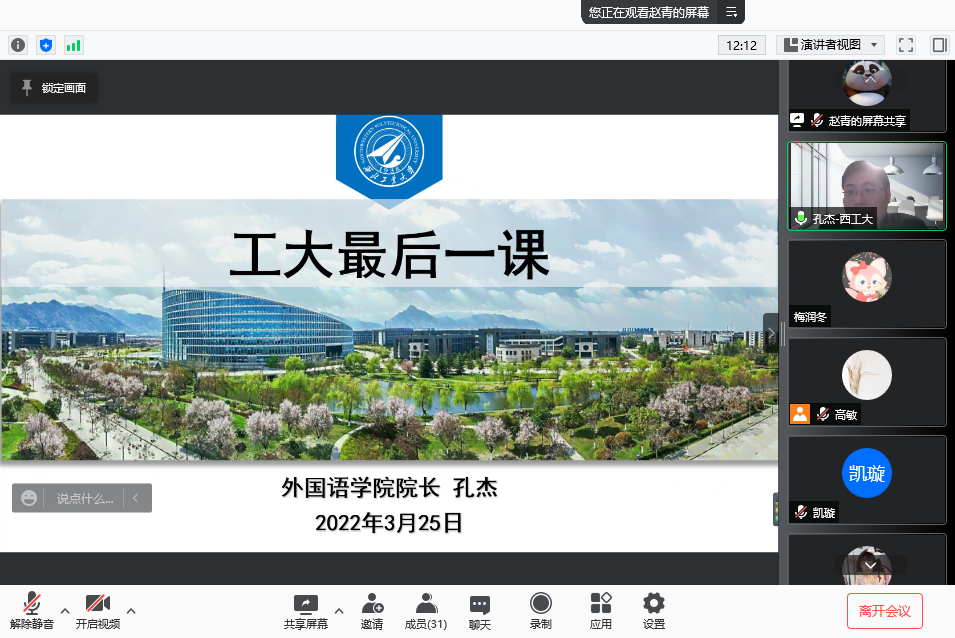 疫情阻隔了距离,却阻隔不了牵挂。3月25日晚8点,番号 院长孔杰以“求知进取攀高峰,建功立业新时代”为主题在线上为26位即将毕业离开校园的硕士研究生讲授了“工大最后一课”。会议由院党委副书记高敏主持。谈及即将踏入社会,孔杰从三方面为毕业生们送上寄语。首先,立足当下,分析自己的利弊和痛点所在,做好谋略性的长远规划。他通过举例,指出不论受到外界的赞扬还是非议都要依然能守住原则,拥有不忘初心的从容品质...