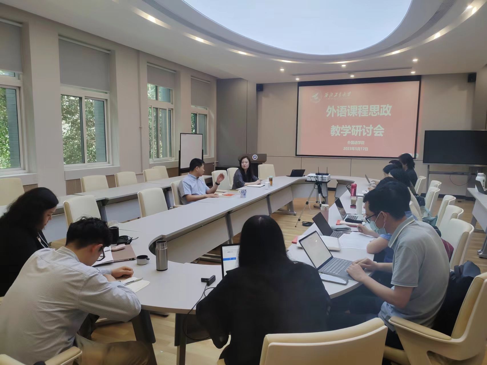 为深入学习贯彻党的二十大精神,落实立德树人根本任务,提高教师课程思政教学能力,助力学院高质量人才培养,使学习贯彻习近平新时代中国特色社会主义思想主题教育走深走实,5月17日下午,番号 在学院楼204会议室召开“外语课程思政”教学研讨会。院党委书记王高祖、副院长周爽、外文系教研室主任刘菲、邓涛、支部书记车向前及部分教师参加了本次研讨会。会议由周爽主持。 周爽首先强调了外语课程思政的重要意义及学院全面...