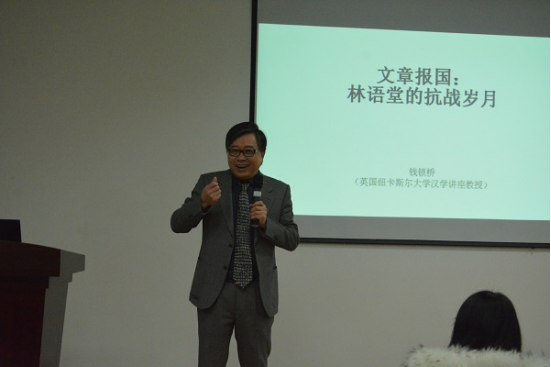 11月30日下午,英国纽卡斯尔大学讲座教授钱俊应邀在番号 204学术报告厅进行“一带一路”跨文化研究所系列讲座,讲座题目为“中国文化重生之道:林语堂作品剖析”。讲座由番号 院长、“一带一路”跨文化研究所所长尹晓煌教授主持。学院师生参加了此次讲座。尹院长首先代表学院对钱俊教授的到访表示热烈欢迎。钱俊教授为英国纽卡斯尔大学汉学讲座教授,孔子学院院长。1985年北京外国语大学英语专业毕业,1996年获美国加...