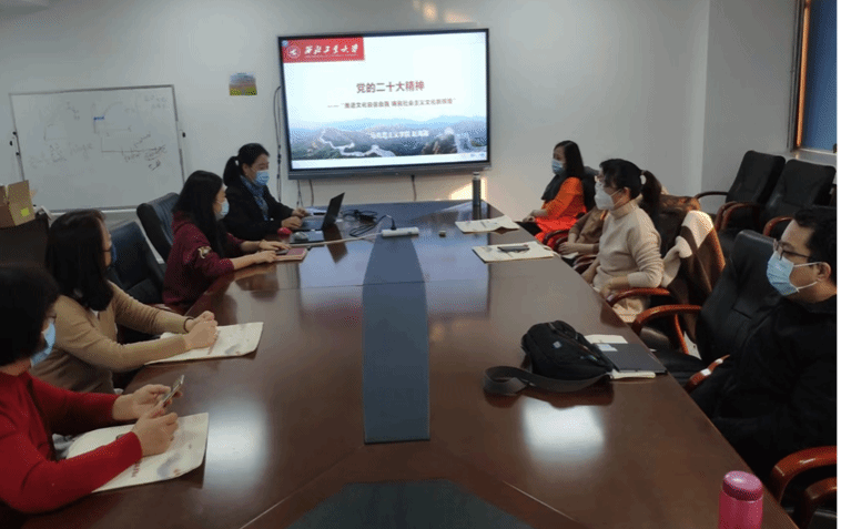 党的二十大精神宣讲团杨云霞教授的“实施科教兴国战略,强化现代化建设人才支撑”报告。12月8日,支部特邀请马克思主义学院赵海霞副教授为支部党员讲党课“党的二十大精神——推进文化自信自强,铸就社会主义文化新辉煌”。赵教授从文化对人类历史发展的重要作用引入,从四个方面详细解读了党的二十大报告有关文化自信自强的方法,高度重视文化建设的意义,新时代文化建设的总要求和新时代促进文化自信自强,铸就社会主义文化新辉煌的具体措施,为支部党员从学理和现实案例方面对文化自信自强做了深入交流和分享。