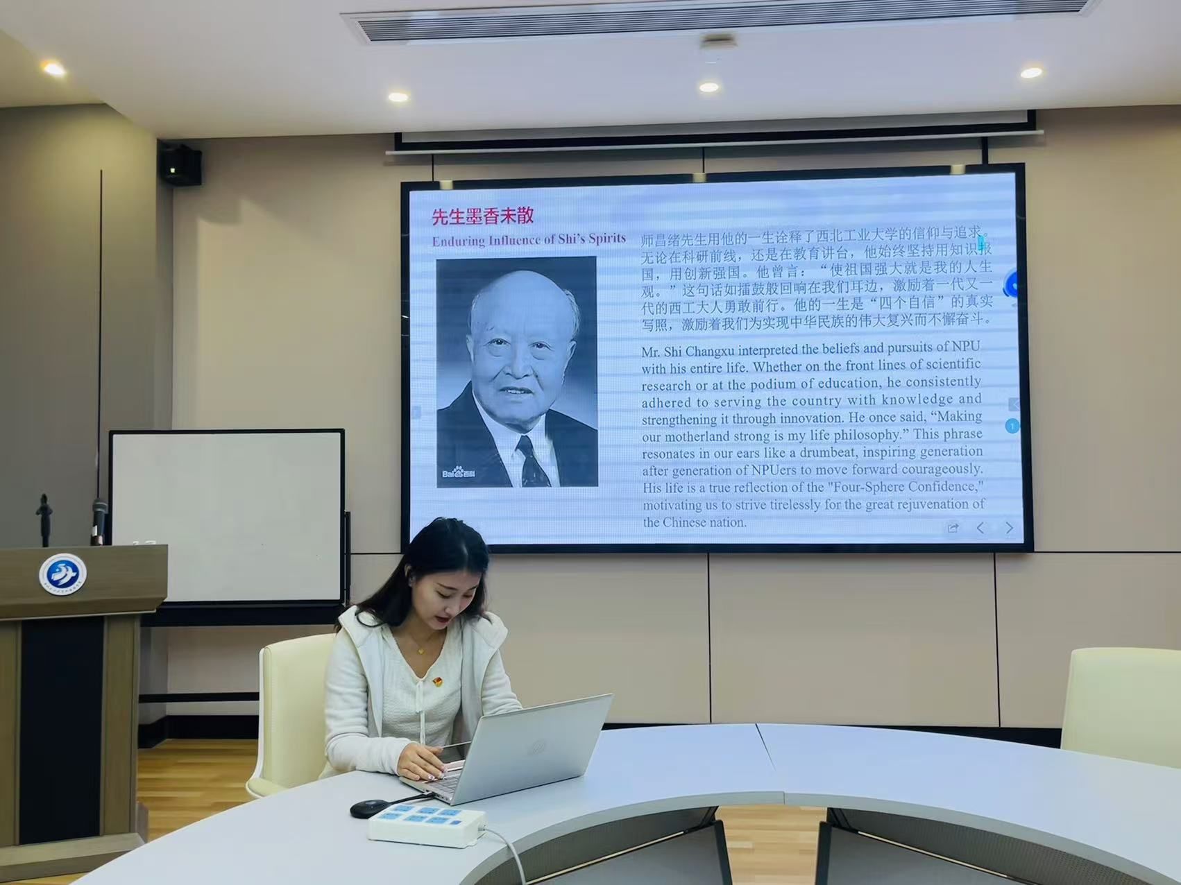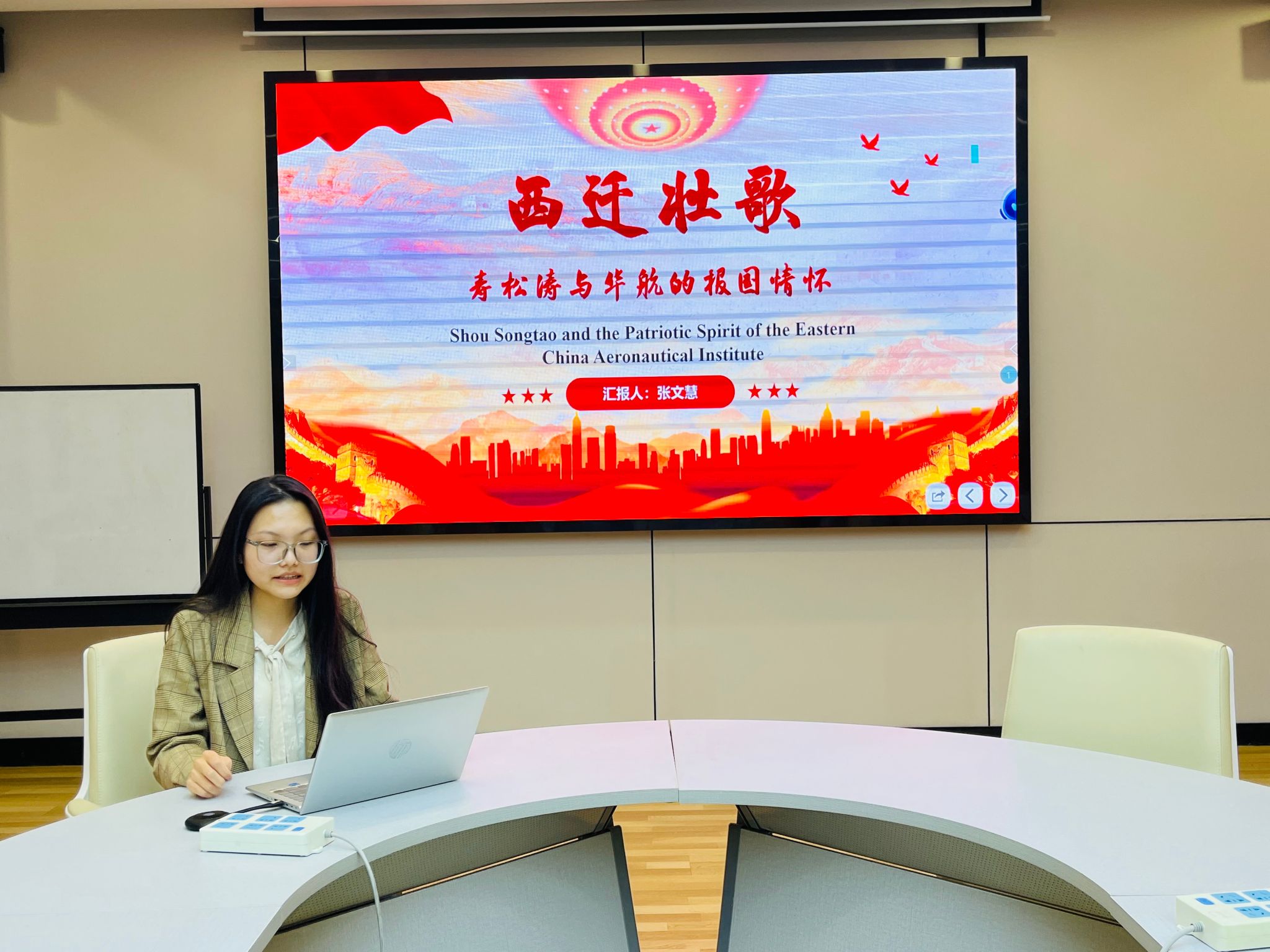 张文慧同志叙述了寿松涛校长与华航的西迁壮歌。“建设大西北,振兴新中国的航空事业!”他们积极响应党的号召,肩负神圣使命,义无反顾奔赴条件艰苦的大西北,成就了西工大世纪壮歌。我们应该深刻认识到“社会主义制度集中力量办大事”的优越性,在日常实践中增强自身责任担当,紧密团结在党的旗帜下。