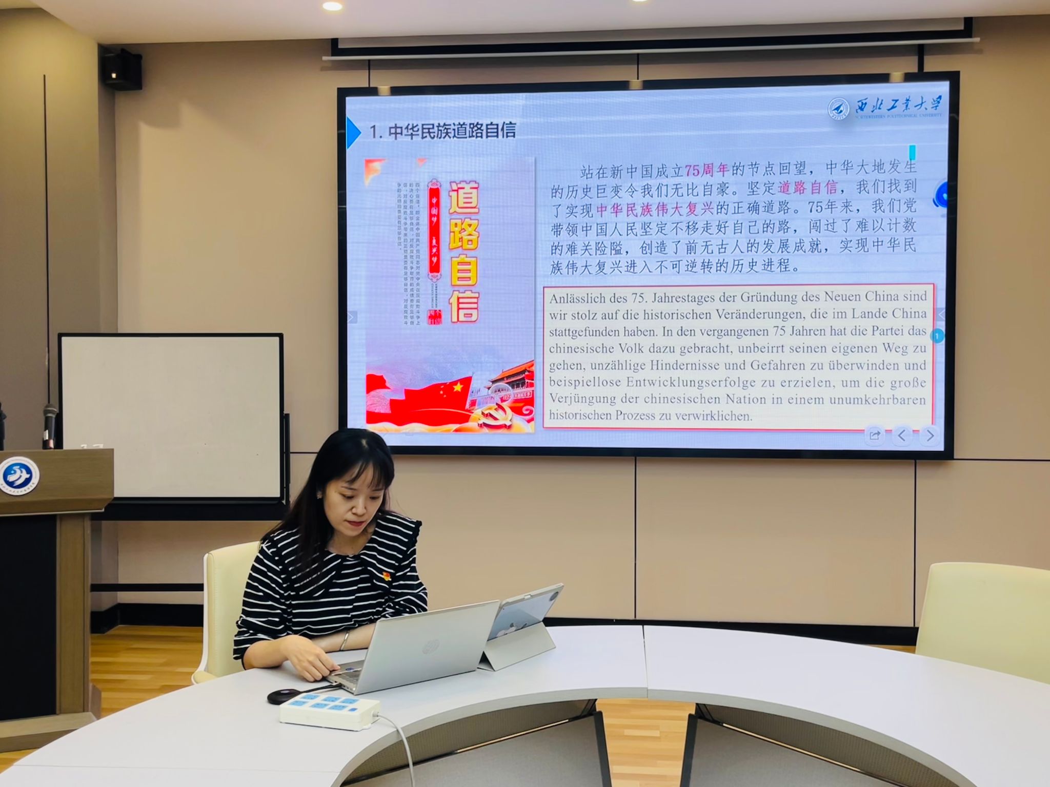 毛雅雯同志以德语讲述了优秀校友李鸿毅然投身西北军营,扎根戈壁荒漠十六载的感人经历,她不畏艰险,决心用知识和技术捍卫国家的和平崛起。
