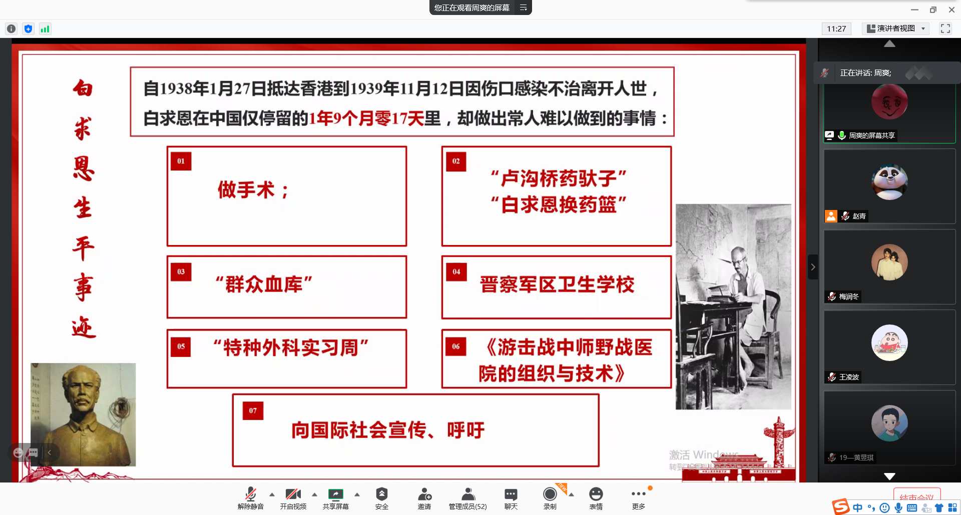 周爽从白求恩的生平事迹讲起,1937年抗日战争爆发,他率领一个由加拿大人和美国人组成的医疗队来到中国解放区,1938年4月经延安转赴晋察冀边区,在那里工作了两年,在战地进行了医疗救助和医疗培训。不顾抗战的紧张局势和晋察冀边区的炮火,白求恩同志始终坚守在战地一线,一次次将中国战士和人民群众从死亡中抢救。毛主席将其评价为“一个高尚的人,一个纯粹的人,一个有道德的人,一个脱离了低级趣味的人,一个有益于人民的人”。也由此引出了白求恩精神:伟大的国际主义、共产主义精神;就是毫不利己、专门利人无私奉献的精神;就是对工作极端热忱、精益求精的精神。