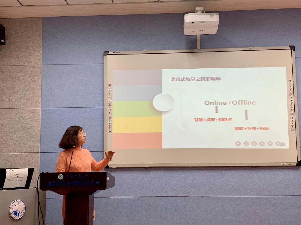 接下来屈江丽老师就线上线下混合式教学模式具体教学过程的开展做了分享。屈老师着重介绍了教师如何处理线下的教学活动内容及学生线上SPOC学习内容之间的关系,介绍了她在具体教学活动设计上的经验。强调了线下教师授课内容一定是对学生线上学习内容的翻转(应用)、补充和拓展。