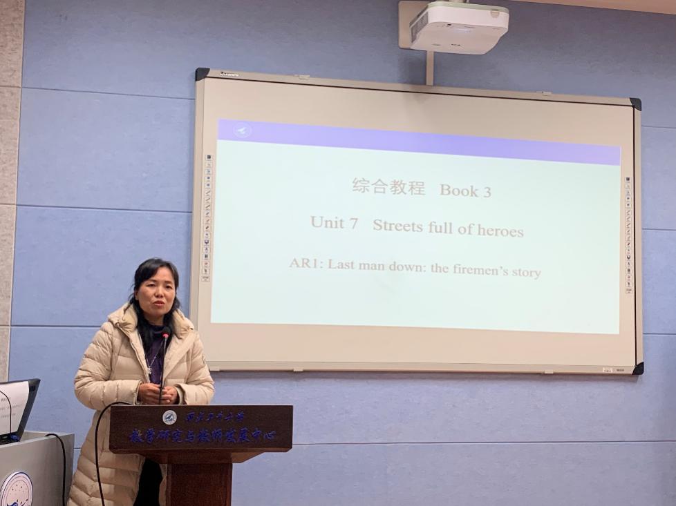 曹杨老师通过对《高等学校课程思政建设指导纲要》中课程思政定义以及文史哲类课程思政建设指导方针的介绍,帮助参会教师理清了课程思政建设的思路。接着曹老师以《新标准大学英语综合教程》中一个单元为例,介绍了大学英语课程“课前,课中和课后”思政教学设计思路。