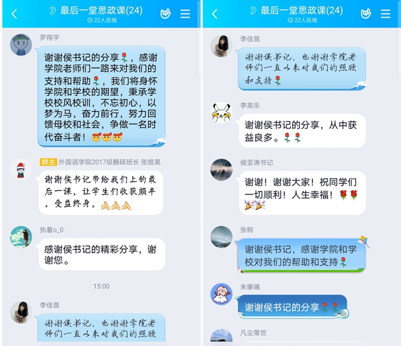 课后,同学们在线上表达了对侯书记的感谢和对学院栽培的感激之情,并在群内分享了自己的上课心得。相信经过本次课堂教育,同学们将信心满满,带着母校和师长的祝福在新的人生征程上迈出更加坚定的步伐。