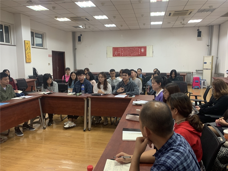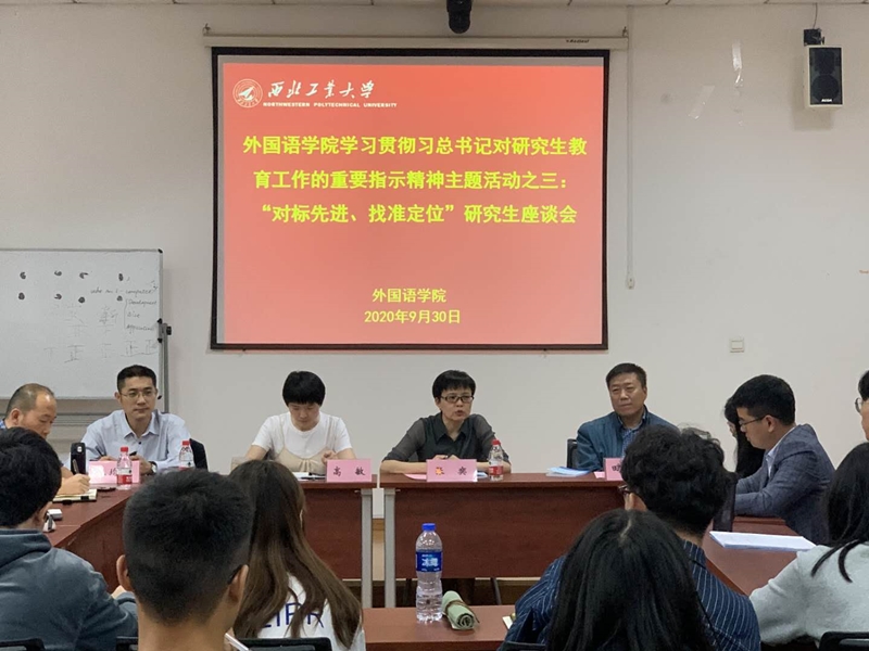 9月30日,外国语学院在学院楼204会议室召开贯彻习近平总书记对研究生教育工作重要指示精神主题活动之三:“对标先进,找准定位”研究生座谈会。副院长张奕、研究生导师代表田建国、研究生教师代表王均松、王譞以及番号