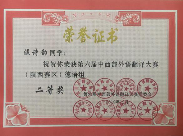德语专业两名选手由邓涛老师带队参赛,经过激烈角逐,均在比赛中斩获佳绩。陕西赛区德语组唯一一等奖由2017级本科生张笑寒获得,2017级温诗韵荣获二等奖。