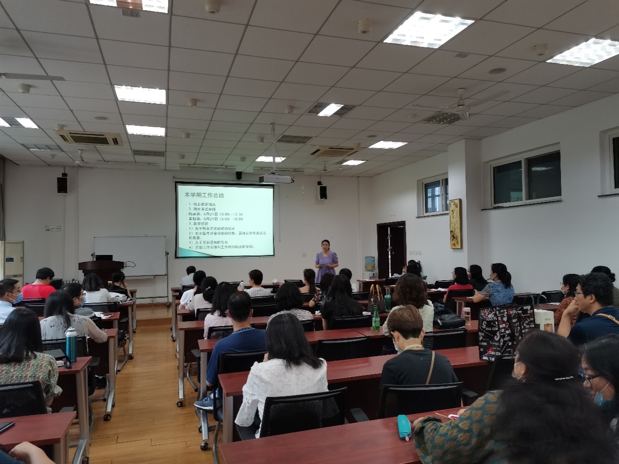 大学英语教学部主任孙静首先对疫情期间系部的工作进行了介绍,并对下一个学期的总体教学工作进行了安排部署。疫情期间,大学英语教学部全体教师同心同德, 克服困难,积极应对教学方式的转变,开展线上教学,直播教学和MOOC/SPOC结合等多种教学模式,表现出对工作认真负责,对学生高度耐心的态度,高质量地完成了本学期的教学任务,受到了领导和学生的一致好评。下个学期,大学英语教学部将在现有分层教学和混合式课程教学改革的基础上,进一步推进教改方案的实施,细化分级分层,施行模块化教学,使教学更加具有针对性,课程更加多元化,推动更多教师参与到教学模式和教学方法的改革中。孙主任同时强调了外语课程开展课程思政的重要性,呼吁系部教师将教书与育人相结合,切实把思政内容融入到自己的课堂教学中去,培养学生的家国情怀。