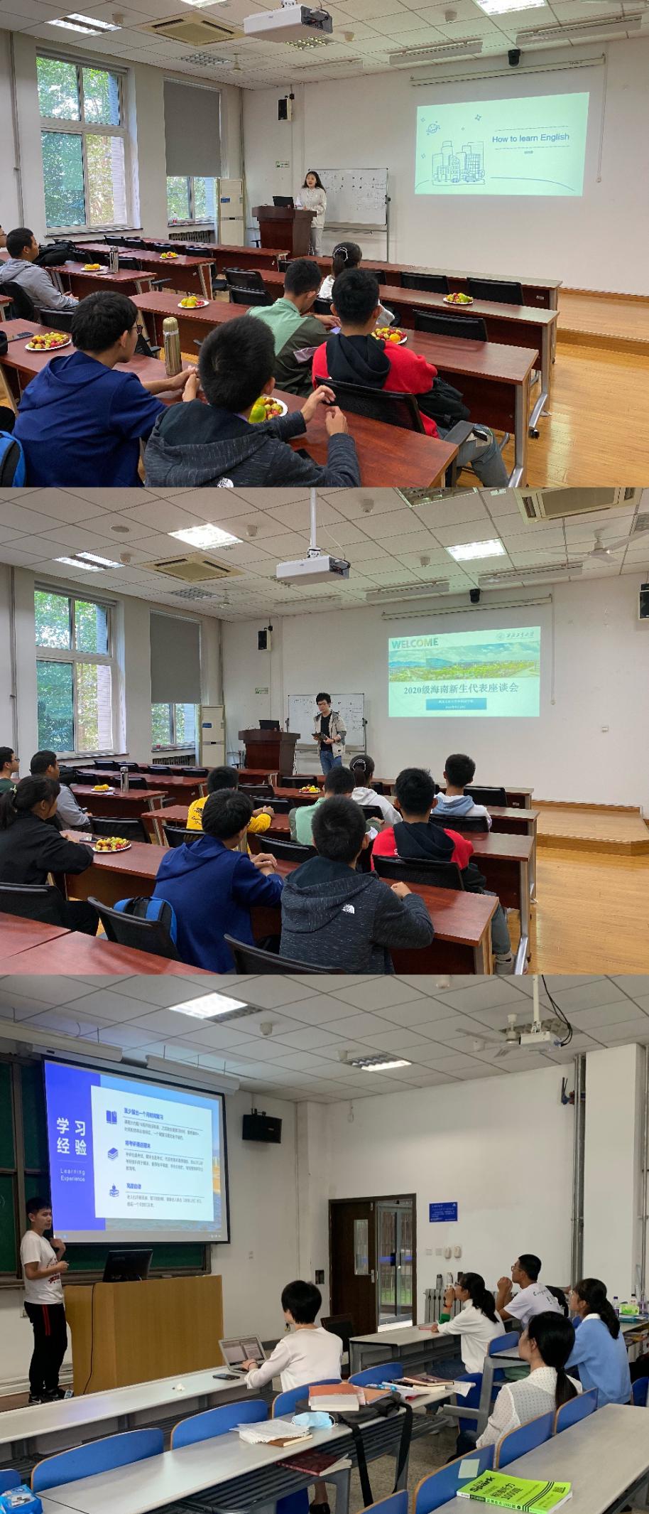 英语专业学生代表项祎霖、2018级软件学院海南籍学生符育玮和2018级航天学院海南籍学生乔诗展和与会同学进行了学习和生活上的交流与分享。项祎霖同学向与会新生分享了自己“如何学好英语”的丰富经验,她从单词、听力、阅读、作文等不同角度详细介绍了自己培养语感的方法,总结了英语的学习思路;符育玮同学和乔诗展同学作为新生们的“老乡”和学长,从学习、比赛、社交等方面介绍了大学生活。两位同学首先强调了学习的重要性,他指出作为大一新生,一定要注重学习方法;在好好学习的同时,他们鼓励各位新生积极参与机器人、数模、航模、大学英语等各类竞赛及社团,学习感兴趣的各类知识,认识志同道合的朋友,充实自己的大学生活。
