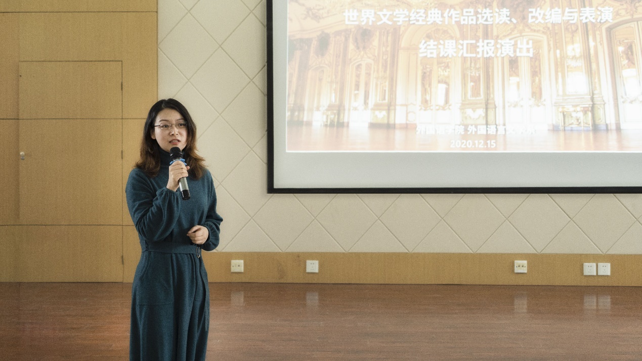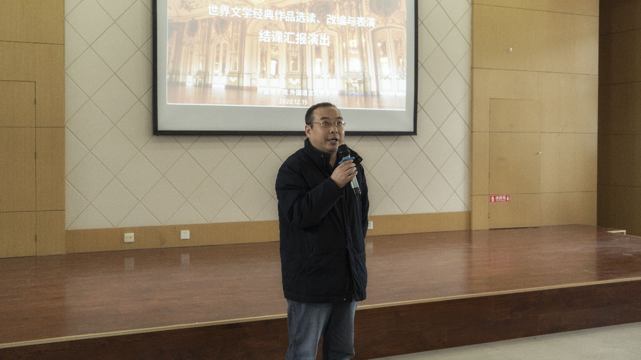 举头为夏、俯首是冬。近日,首批专业综合设计类课程《世界文学经典作品选读、改编与表演》在长安校区举行汇报演出。学院党委书记侯亚涛,副院长周爽、臧小佳,党委副书记高敏,外国语言文学系系主任、课程负责人李利敏,办公室主任王晓丹,本科教学秘书崔诗晴以及全体任课教师来到会场,欣赏了同学们精心准备的课程汇报。