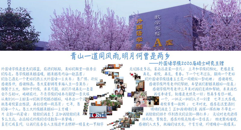 2017级硕士研究生以一张特别的海报寄托了对母校和学院浓浓的情谊,海报上融入了毕业生的祝福,还有用他们在工大生活的点滴照片拼成的学院LOGO,表达着他们永远是工大外院一份子的情怀。