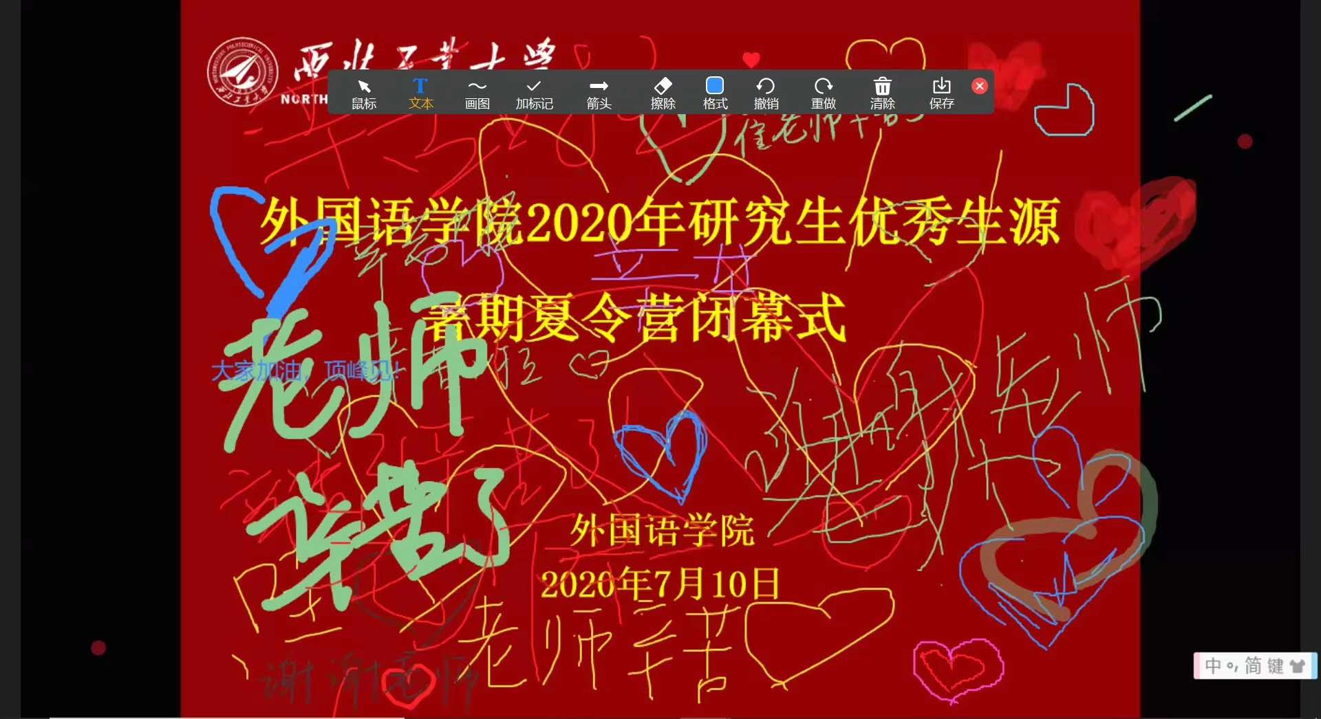 除此之外,学院分别于9日晚上和10日上午、下午三个时间段,分为7组,对本次夏令营的同学进行分组综合面试,面试内容包含5分钟PPT英语自我介绍和现场提问,参与面试的导师达到23人次。夏令营闭幕式后,同学们久久不愿离开会议室,用语言、文字、图画等形式表达着对本次夏令营活动组织老师辛勤付出的感激之情以及对来到番号