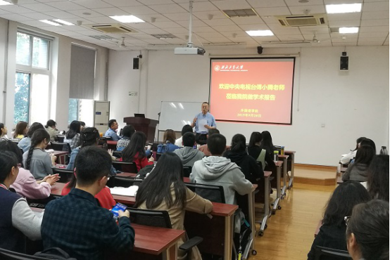 尹晓煌院长首先简要介绍了傅小腾老师,并对傅老师的到来表示热烈欢迎。傅小腾老师在中央电视台工作,曾导演过多项重要节目,包括《感动中国》总导演、《神州五、六、七、八、九号载人航天火箭发射》直播导演、《嫦娥奔月》直播特别节目、《纪念中国人民抗日战争暨世界反法西斯战争胜利70周年阅兵》等,并获多次奖项。2016年赴美工作,曾报道中美贸易摩擦、拉斯维加斯枪击案等新闻。
