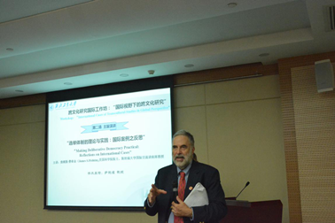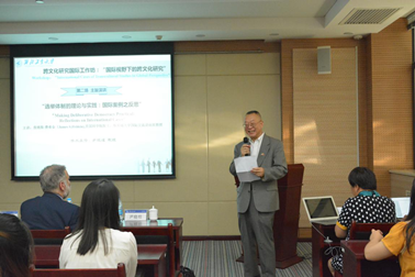 “一带一路”跨文化研究所主办的“跨文化研究国际工作坊”:“国际视野下的跨文化研究”在友谊校区国际会议中心第一会议室盛大召开。工作坊分别由尹晓煌院长和臧小佳副院长主持,美国斯坦福大学人文讲座席教授、美国研究系主任Shelley F. Fishkin,及美国科学院院士、斯坦福大学国际交流讲座席教授James S. Fishkin为工作坊主旨发言人。番号
