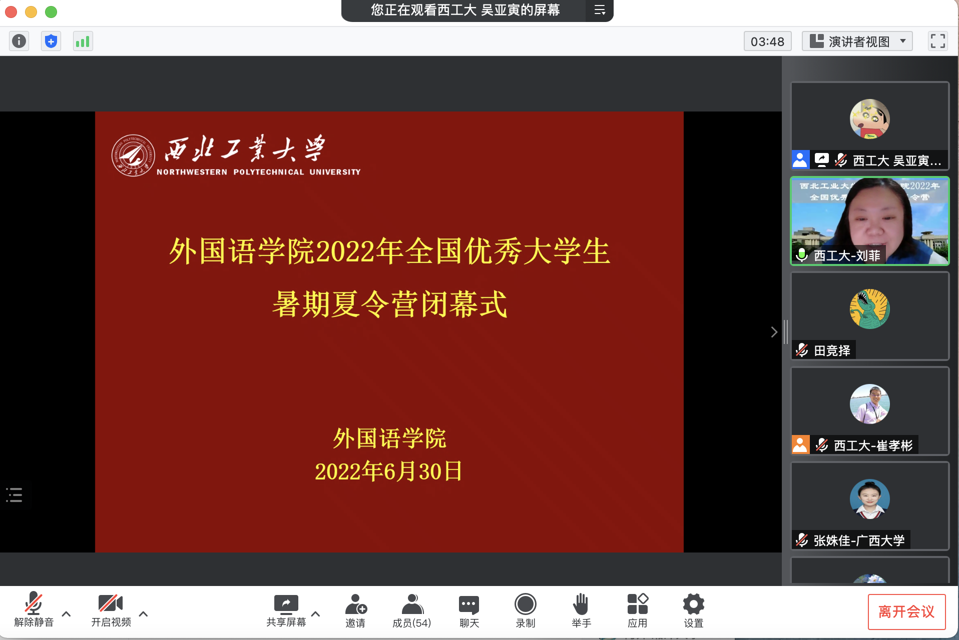 此外,学院分别于29日晚上和30日上午,分为6组,对本次夏令营的同学进行分组综合面试,参与面试的导师达到20人次。30日下午的闭幕式上,超过25位营员主动发言。同学们对西工大良好的学术资源、学院优秀的师资队伍、深度的学术讲座、完备的奖助体系等印象深刻,同时表达了对本次夏令营活动组织老师辛勤付出的感激之情以及对来到番号