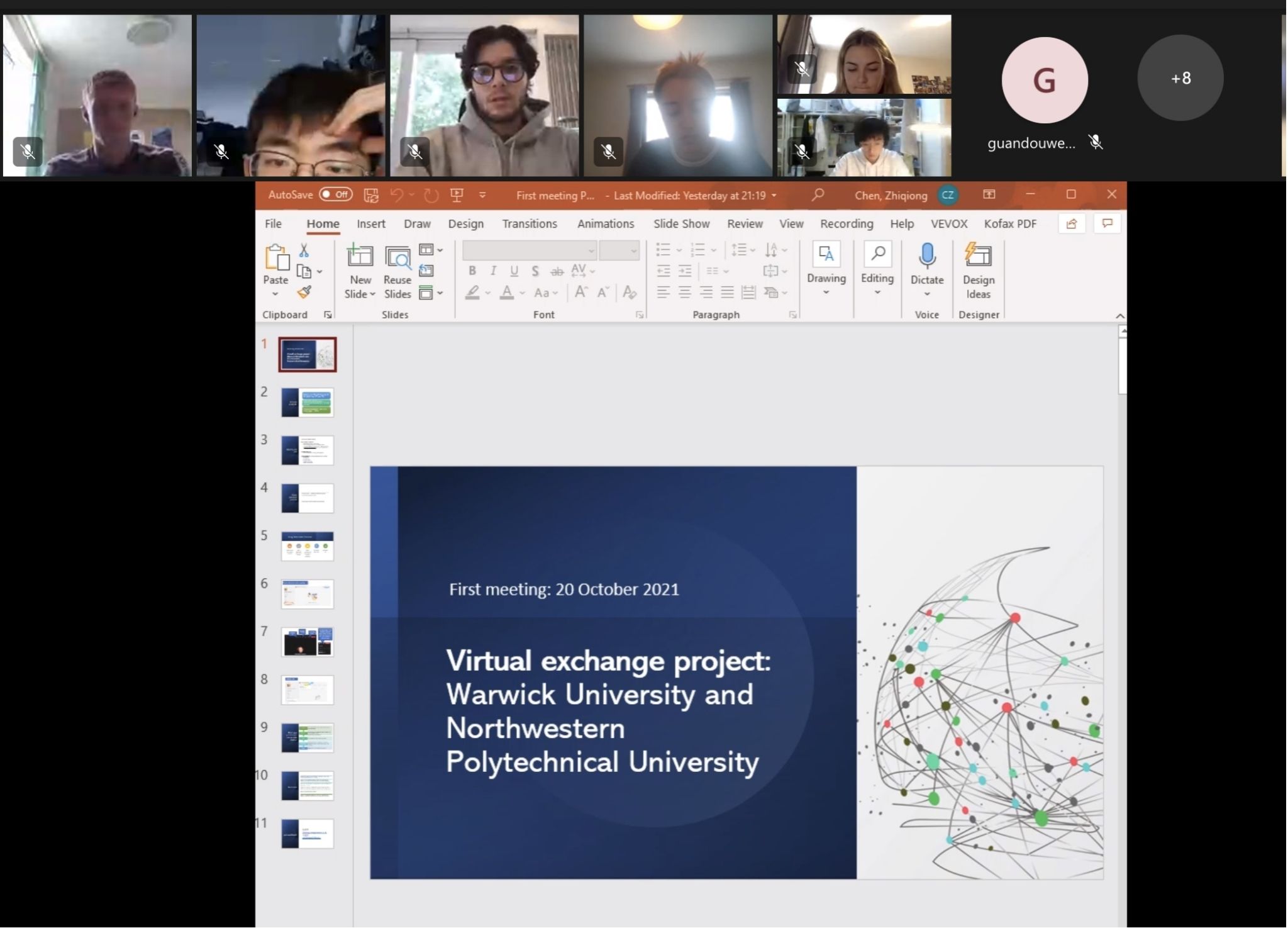 德语专业学生与华威学校学生依照“一对一”或“二对一”的模式匹配分组,每组每周进行一次线上讨论,内容包含中外的生活日常、校园生活、国家的历史渊源及文化知识等,并在项目结束后做汇报展演。番号