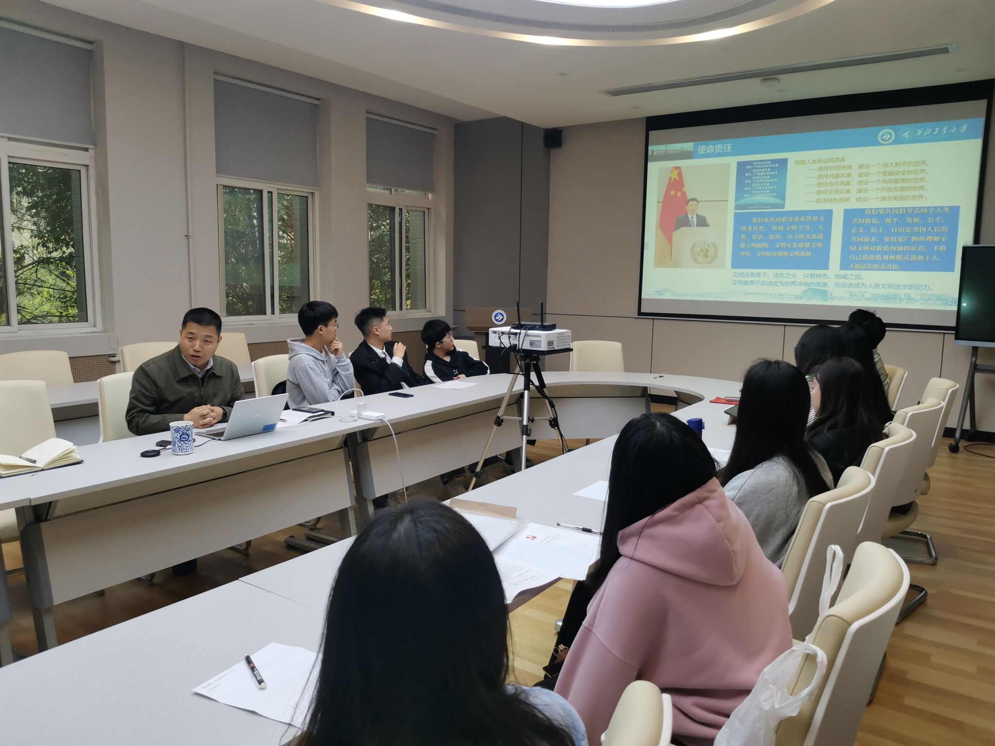 党委书记王高祖以“牢记公诚勇毅校训,筑牢深厚家国情怀,精研语言文化,胜任文明互鉴”为题,在学院204会议室为番号