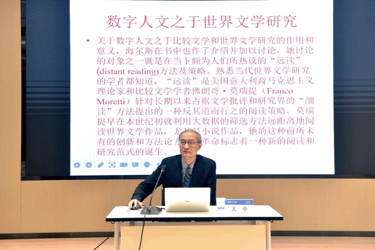王宁教授的发言题目是“数字人文:比较文学和世界文学研究的科技转向”。他针对人工智能软件ChatGPT给人文学科带来的严峻挑战,探讨人文学术研究与数字科学技术之间密切的对立、互补和对话关系。他认为,基于大数据的“远距离阅读”策略应该被视为比较文学和世界文学研究的一种新的范式的兴起。数字人文这个新研究领域标志着具有转折和范式意义的新文科的诞生,有望使传统的人文学科走出危机。他进一步指出人文学科的国际评价问题。针对人文学者的国际影响力不足情况,王宁教授呼吁中国人文学者应该具有国际视野,努力以自己的研究实绩跻身国际一流,以适应时代的需要和国际学界对中国的期待。中国学者不仅要在国际中国问题研究中引领潮流,起到主导性的作用,而且还要以产生自中国土壤的经验和成果影响国际学术主流的研究,进而为解决全人类所共同面对的问题提供中国的智慧和拿出中国的方案。