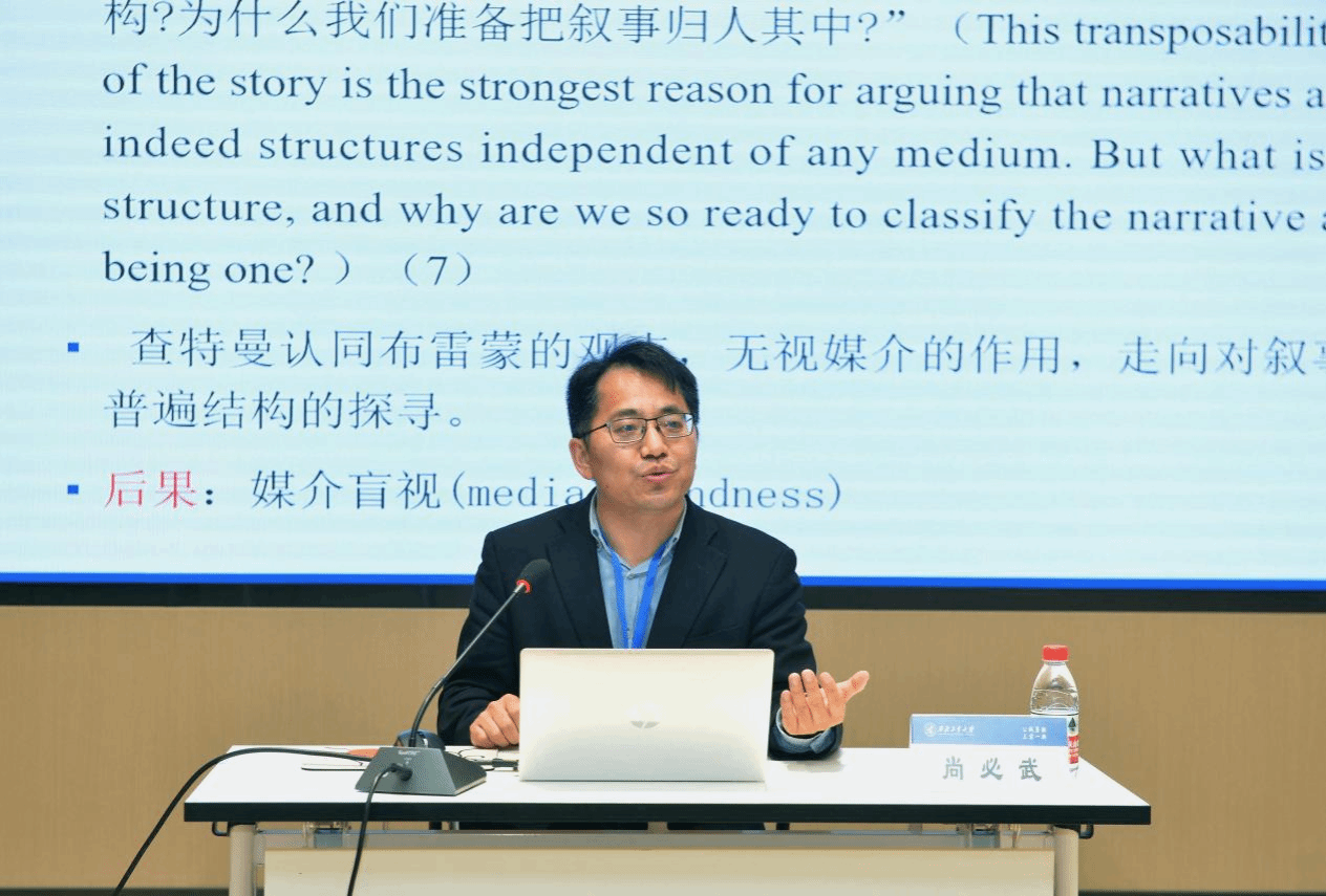 尚必武教授做了题为“跨媒介的故事讲述及其对叙事性的影响”的演讲。他针对克劳德·布雷蒙割裂叙事与媒介之间内在关系的做法,分别从叙事的定义、叙事对象的“二分法/三分法”以及叙事学的定义三个维度,辨析了早期叙事学研究的“媒介盲视”现象与误区,在此基础上讨论故事是否独立于媒介以及故事的跨媒介再现及其叙事性问题。通过引入梅尔·斯滕伯格的修辞-功能叙事理论,指出在故事的跨媒介讲述这一议题上,媒介传递的讯息影响了叙事性,并以德里罗小说《欧米茄点》的跨媒介叙事为例,作出了具体阐述。最后,尚教授指出了跨媒介叙事学的几多裨益。