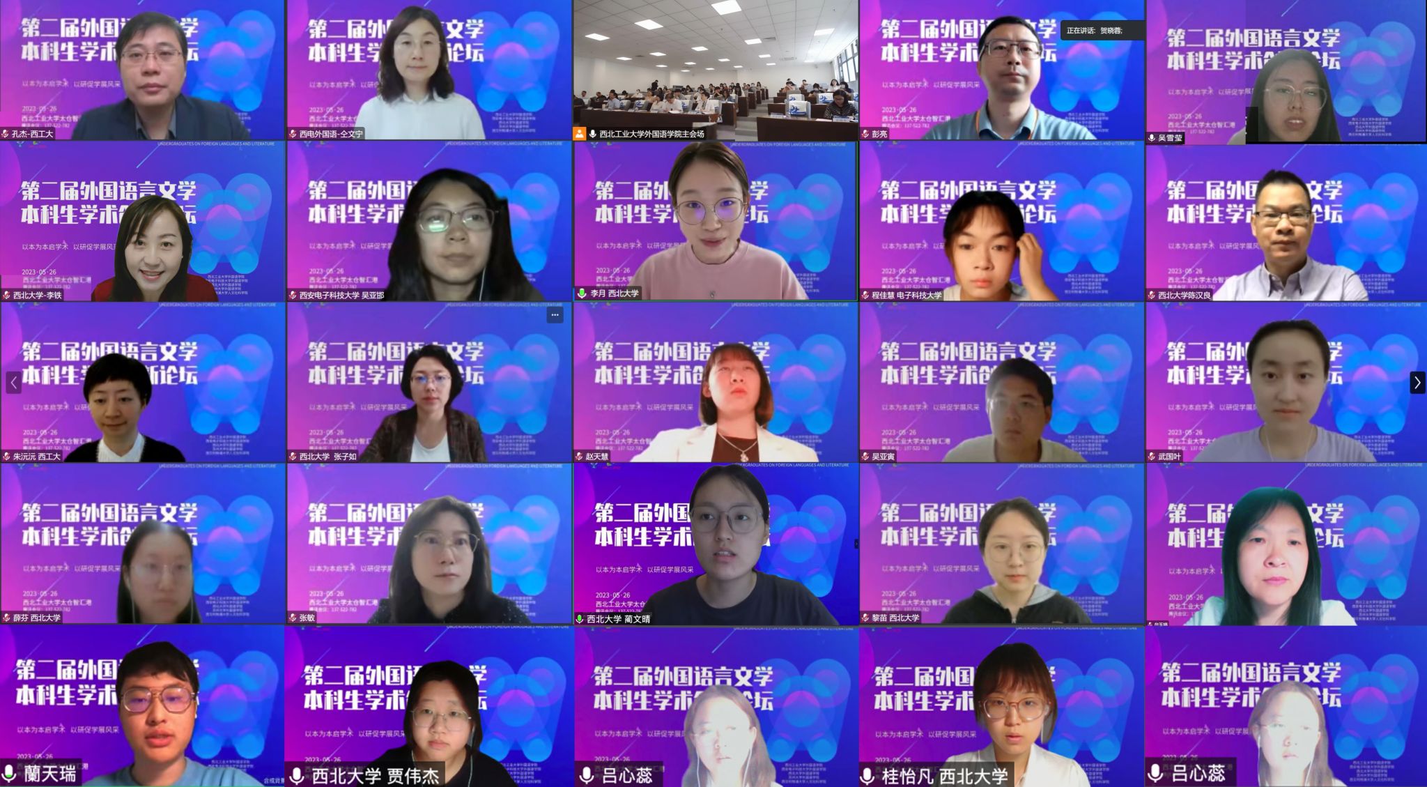 、西安电子科技大学、西北大学、西交利物浦大学、苏州大学的二十余名副院长、系部主任、老师莅临此次论坛。此外,还有来自西安外国语大学、四川外国语大学、长安大学、太原理工大学、电子科技大学、哈尔滨工程大学、四川农业大学、陕西科技大学、合肥学院等14所高校的72名外语专业本科生通过线上线下相结合的方式参会并作报告。番号