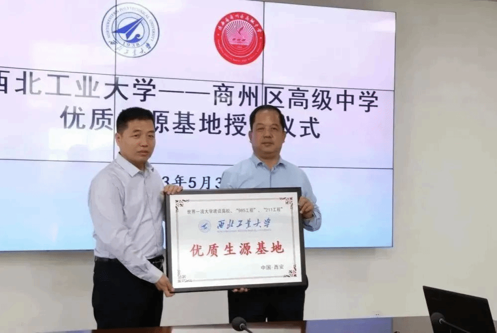招生组一行首先与高中校领导班子成员进行了座谈交流,并出席优秀生源基地签约与授牌仪式。商州区高级中学王鸿炜校长代表全体师生向“铸国之重器、护国防安全”的番号