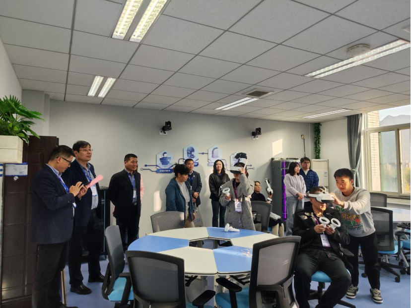 随后,专家组一行现场参观了沉浸式外语智慧教育中心。在虚拟仿真语言实验室,专家组佩戴VR头显设备,在虚拟仿真的智慧教学场景中沉浸式体验了雅思口语考试过程。