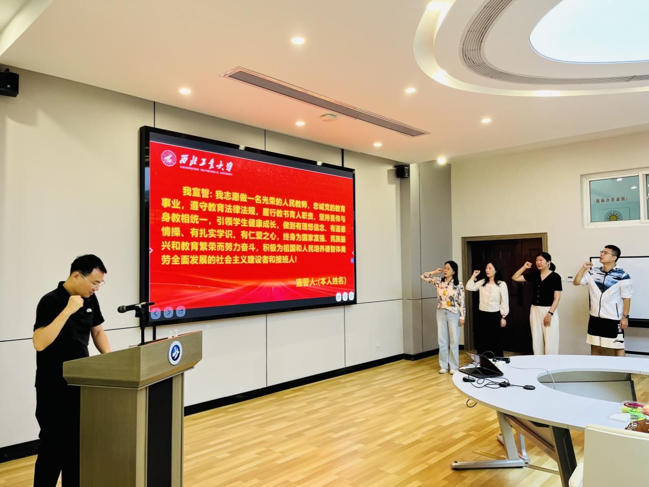 随后,学院为新入职教师举行了入职宣誓仪式。“我志愿做一名光荣的人民教师,忠诚党的教育事业……”5名新教师高举右手,庄严宣誓。孙瑜代表学院对新教师加入学院表示欢迎。她强调,教师应该坚持“为党育人、为国育才”的初心使命,努力践行教育家精神,努力成为师德高尚、业务精湛、潜心育人的人民教师。