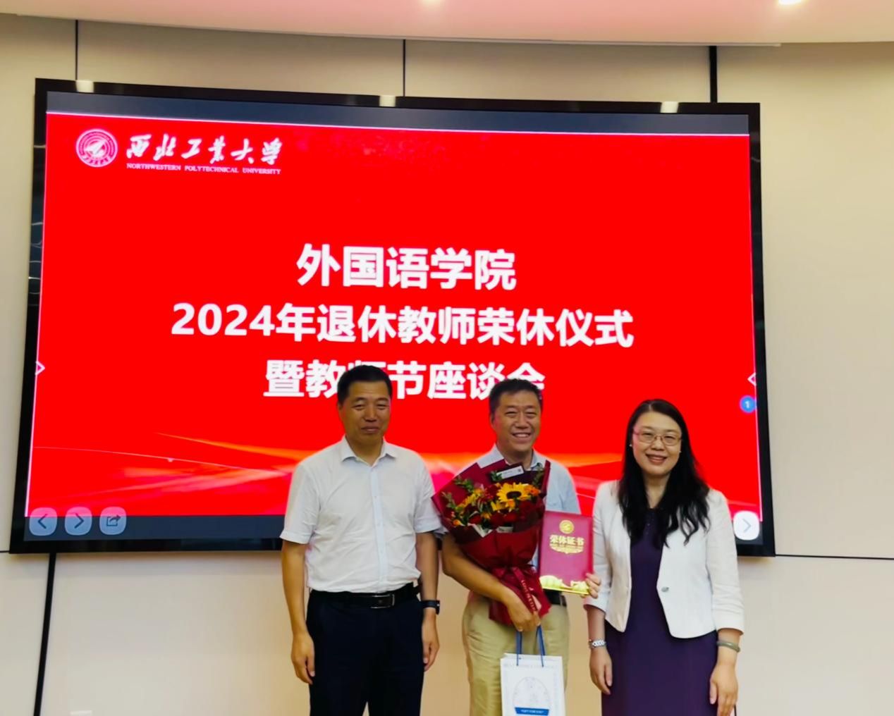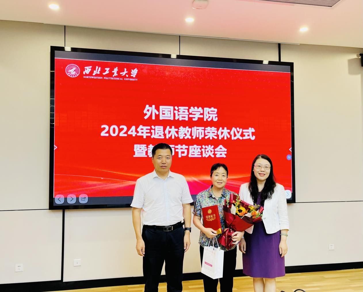 学院领导孙瑜、王高祖共同为三位教师颁发了荣休证书、青年师生则为老教师们献上了鲜花,表达了对退休教师的感激之情、敬佩之情和不舍之情。三位老师满怀深情地回忆了自己在学院的奋斗岁月,畅谈从教生涯的心得和感悟,感慨学院这些年取得的发展与进步,感谢学院和学校一直以来对他们教学科研工作的大力支持,也表达了对教育事业的热爱与不舍。他们鼓励与会青年教师不断钻研、接续奋斗,担负起育人育才的重任。