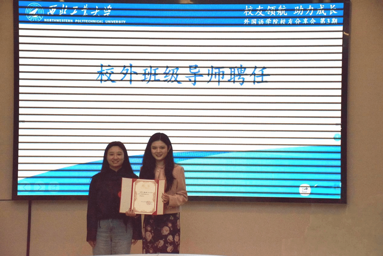 为了发挥优秀校友传帮带的作用,更好帮助外语学子认识职场、拓展视野,学院聘任杨心玮为校外班级导师,张桑桑为其颁发聘任证书。