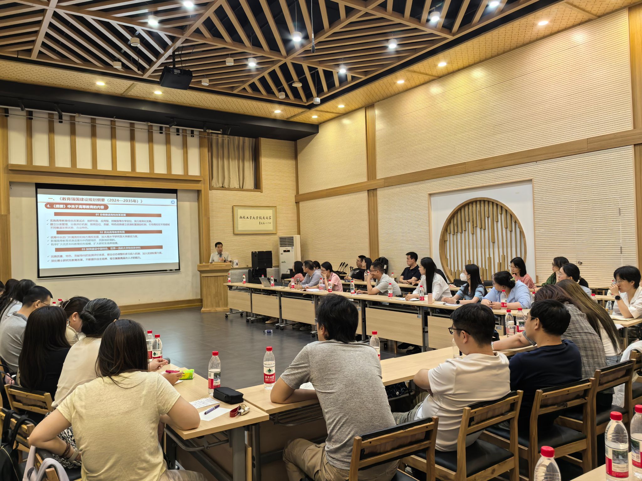 随后,院党委书记王高祖开展研究生导师师德师风培训。他传达了《教育强国建设规划纲要2024-2035》精神,强调教育强国建设中高校教师肩负的使命。深入解读中央八项规定及其实施细则精神,介绍学校、学院扎实推进相关工作的具体实践,要求全体师生严守纪律红线。他指出,要结合学校整体发展状况,对标学科建设目标与人才培养要求,凝练学科方向,提升育人水平,加快建设一流外国语言文学学科。