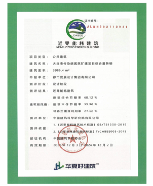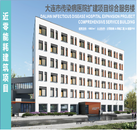 大连市传染病医院扩建项目于2020年开工,该项目是集肺部疾患医治、科研教学、远程会诊、办公休整等为一体的综合性医疗建筑,也是应对突发传染性疾病疫情的重要应急医疗中心。总建筑面积为28900平方米,分为应急医疗楼和综合服务楼。项目率先应用近零能耗建筑理念进行建设和运营,是由大连市政府推动的先行试点工程,亦是大连市践行碳中和理念、推进城市更新行动以及激发建筑业高质量发展的重点示范工程。