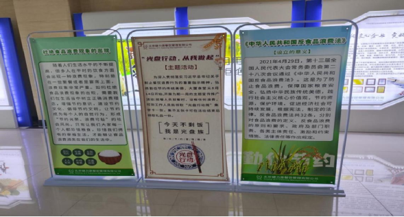 开展常态化宣传教育,将反食品浪费纳入工作人员入职和日常培训体系。组织了以“拒绝舌尖上的浪费”为主题的职工学习培训;开展“迎盛夏、战高温、反浪费、食品安全防患100天”活动并取得圆满成功;在餐厅内取餐区、用餐区、回餐区布置张贴“光盘行动,从我做起”、“节约粮食”、“厉行节约”等宣传展板98处、标语提示牌45处;充分利用电子屏滚动播放“厉行节约、杜绝浪费”等宣传口号;结合世界粮食日、反食品浪费法施行两周年等主题开展“光盘行动周”专项活动。通过上述活动、措施的开展,为宣传普及反食品浪费法营造了浓厚的宣传氛围,引导广大干部职工树立了“适度、健康、责任”的消费理念。